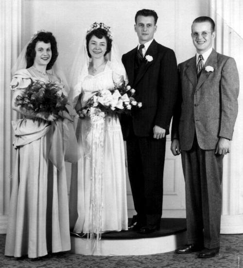 The bridal party had breakfast at the Ursuline Convent. Dinner was served to 40 guests in the VFW clubrooms. Bouquets of the bride and her attendant were on the table. The wedding cake, with it’s miniature bridal couple, was decorated in blue and white, to match the gowns of the bride and bridesmaid. Blue and white ribbons extended to places marked for the bridal couple. A reception is being held this afternoon from 2 to 4 o’clock at the home of the bride’s mother.